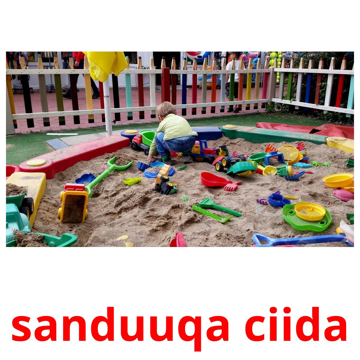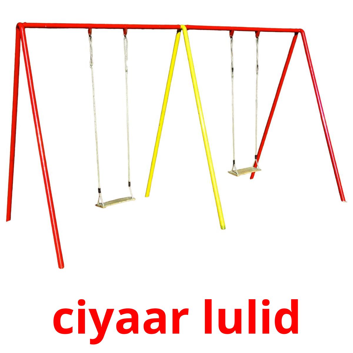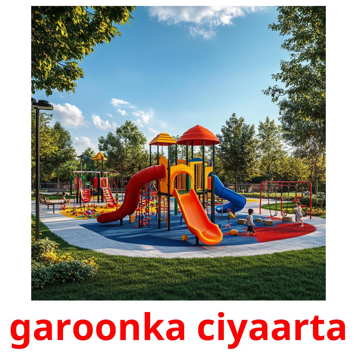 Tulostettava kuvakorttisarja "Garoonka ciyaarta", jossa on seuraavat sanat somalinksi: