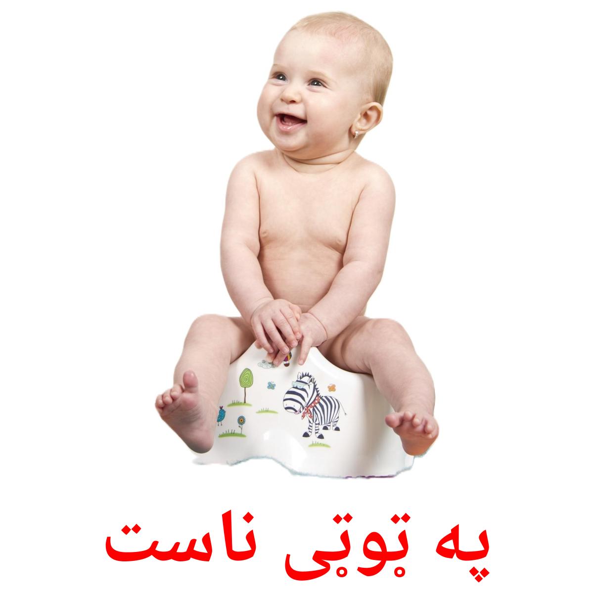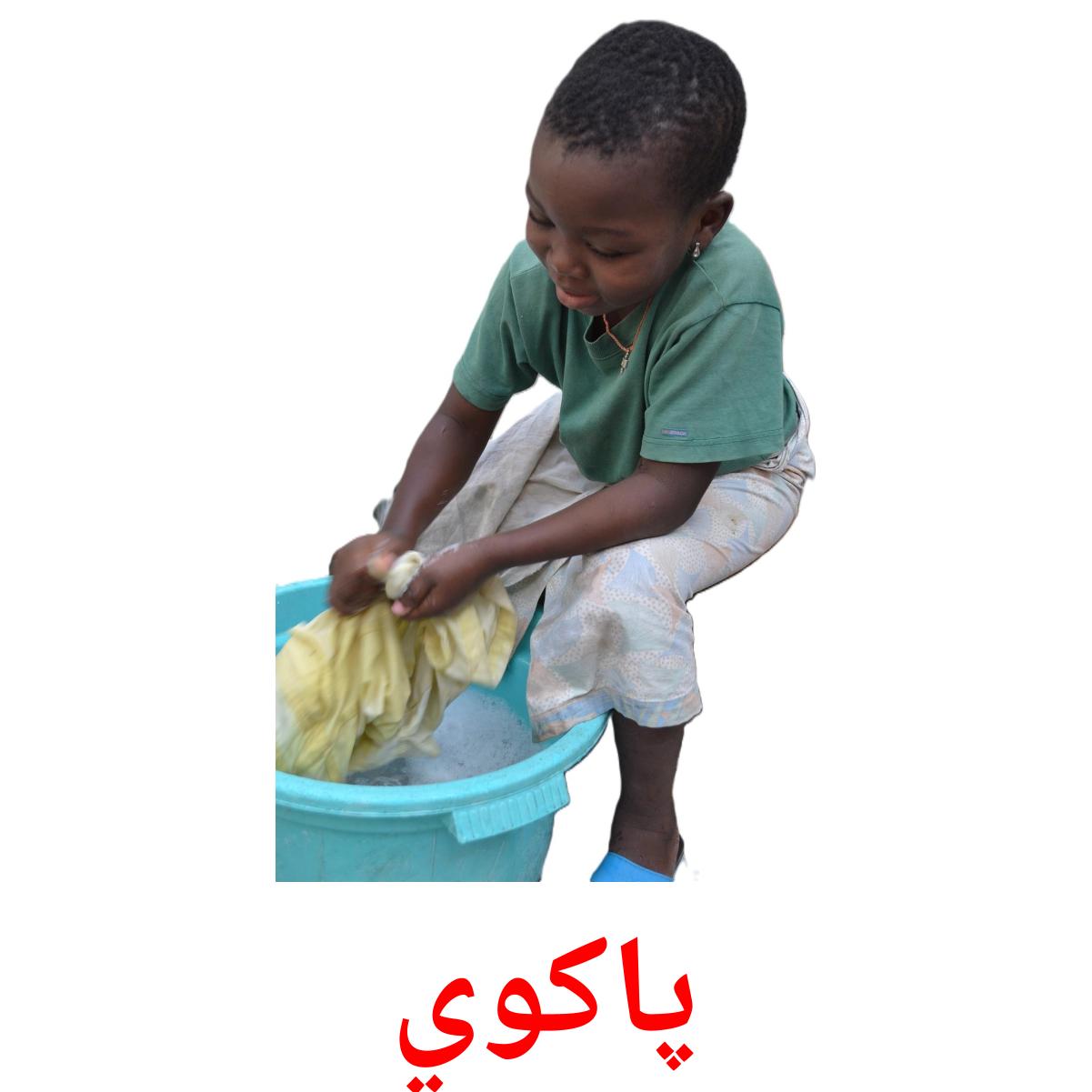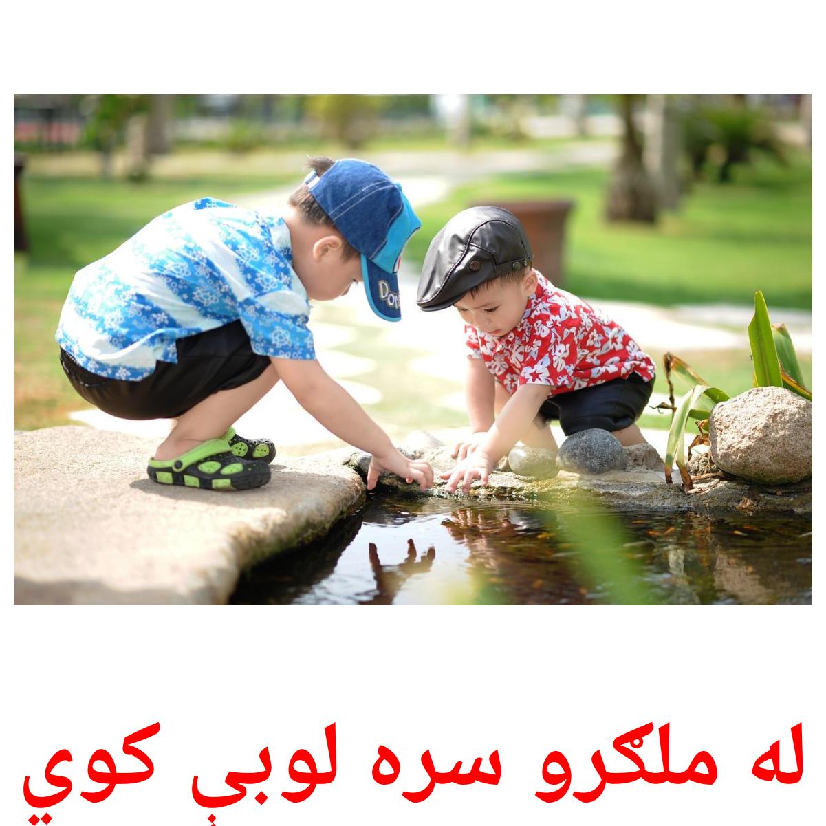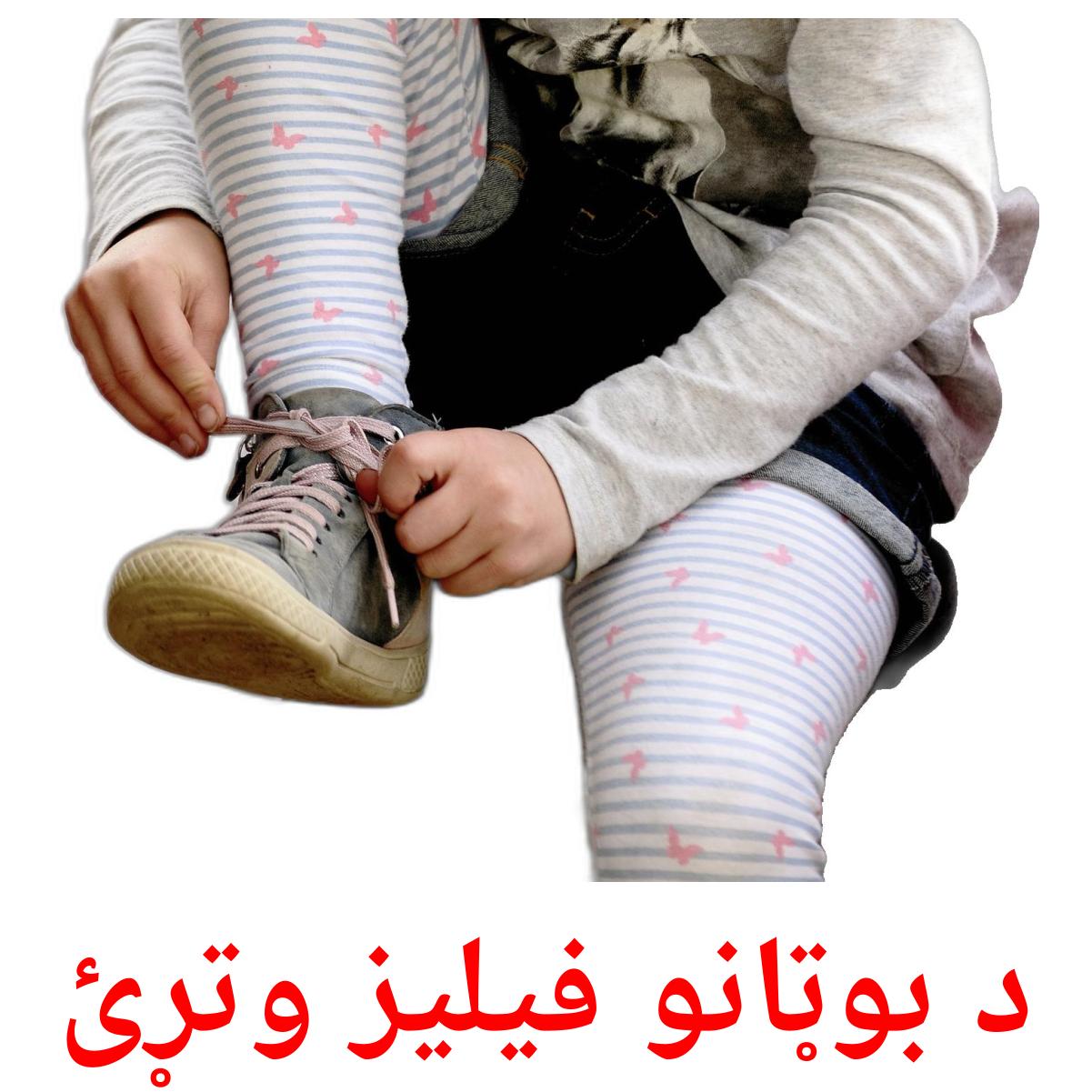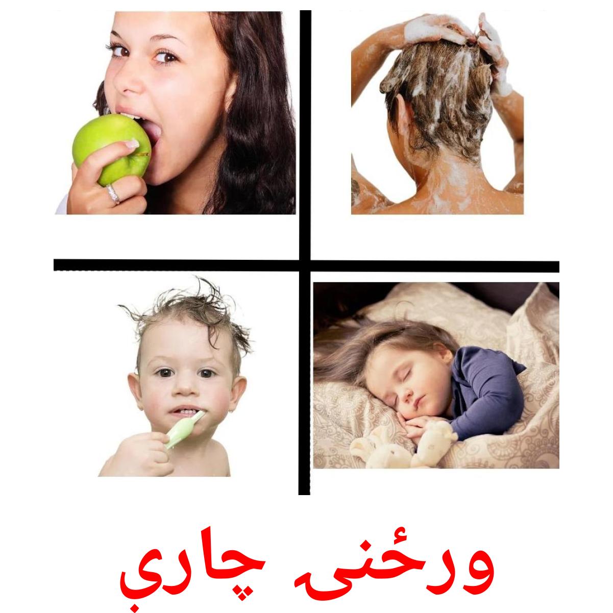 O conjunto de cartões com imagens para impressão "ورځنۍ چارې" inclui palavras em pashto como: